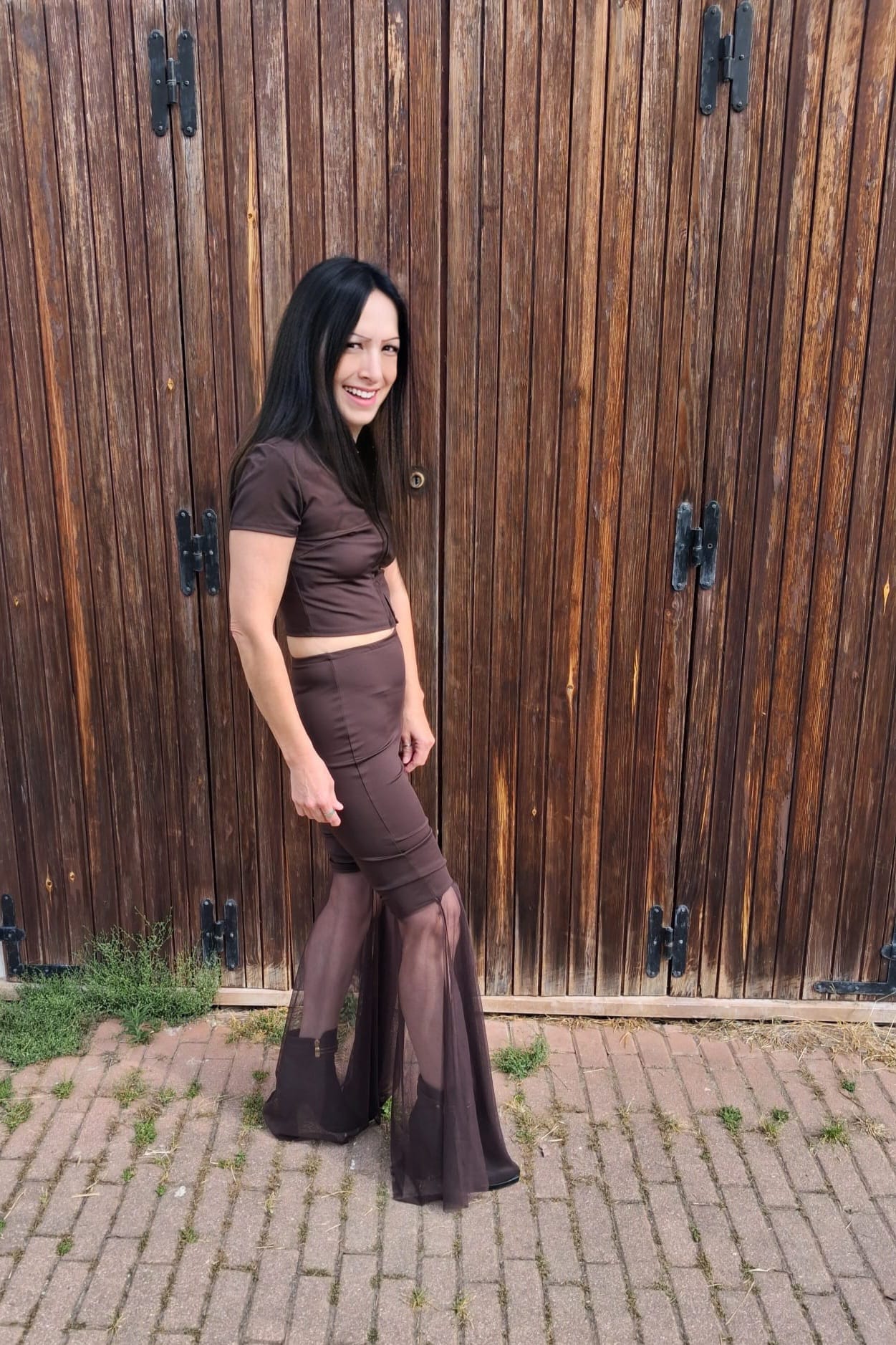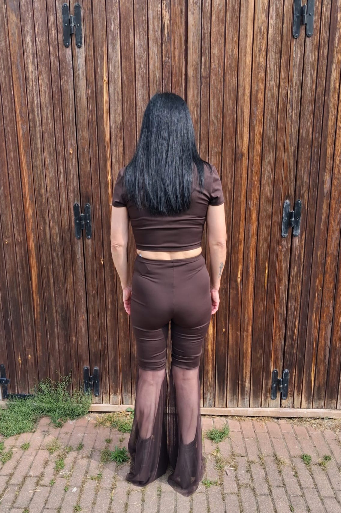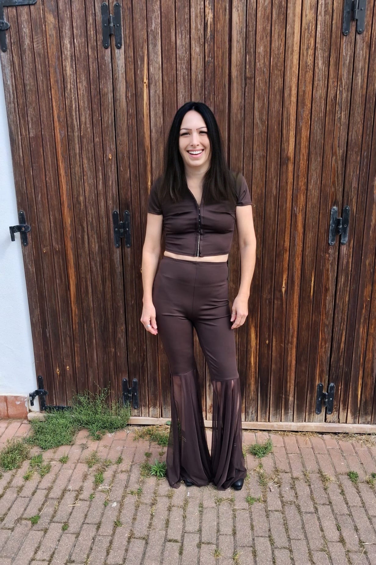 Coordinato composto da top a manica corta con collo alla coreana, apertura a goccia sul décolleté e chiusura con bottoni centrali, abbinato a pantaloni a zampa con inserto in tulle sul fondo che scivola ad ogni passo. Un mix perfetto tra struttura e leggerezza, tra giorno e sera, il completo che trasforma qualsiasi occasione in un momento speciale.